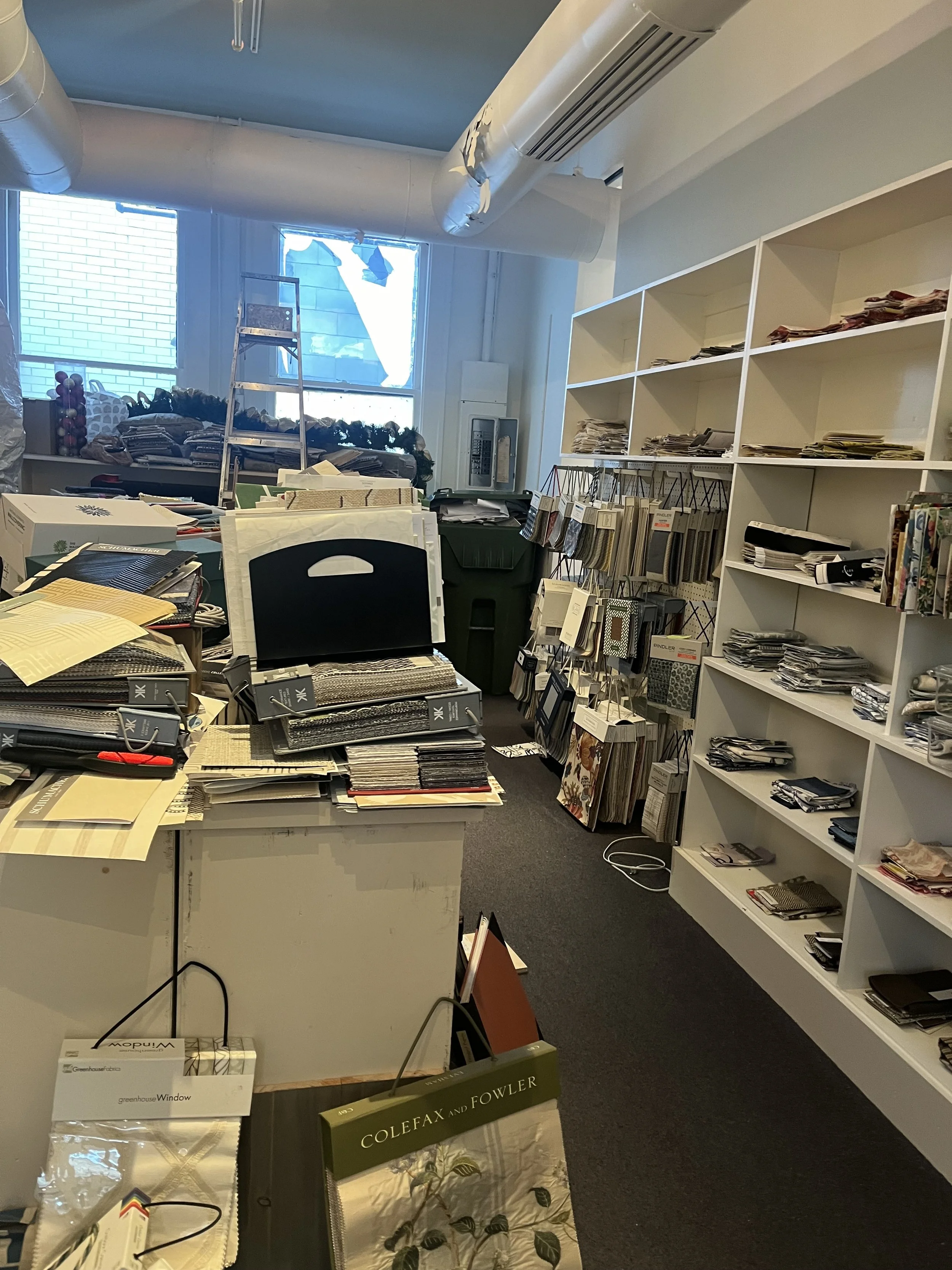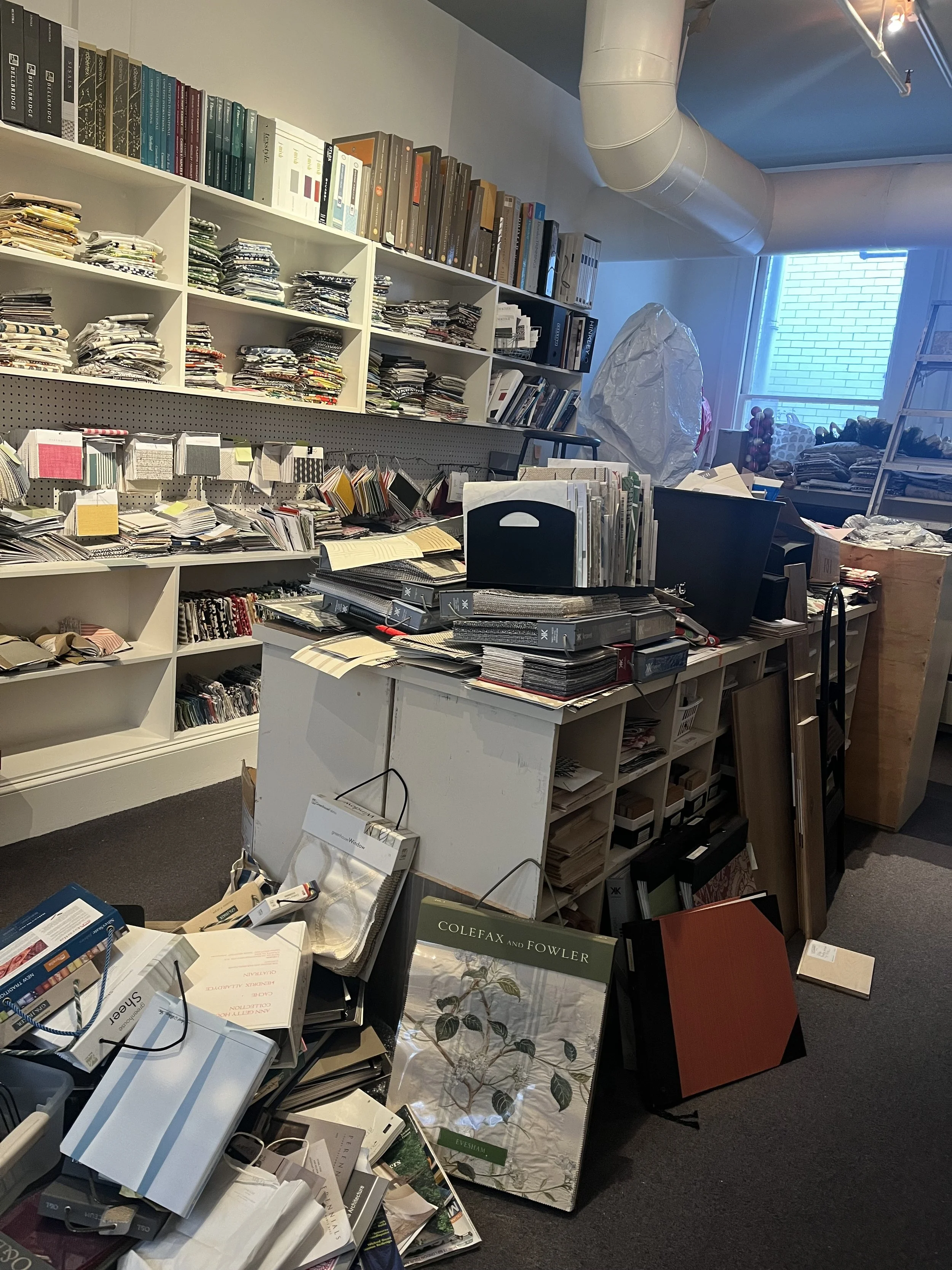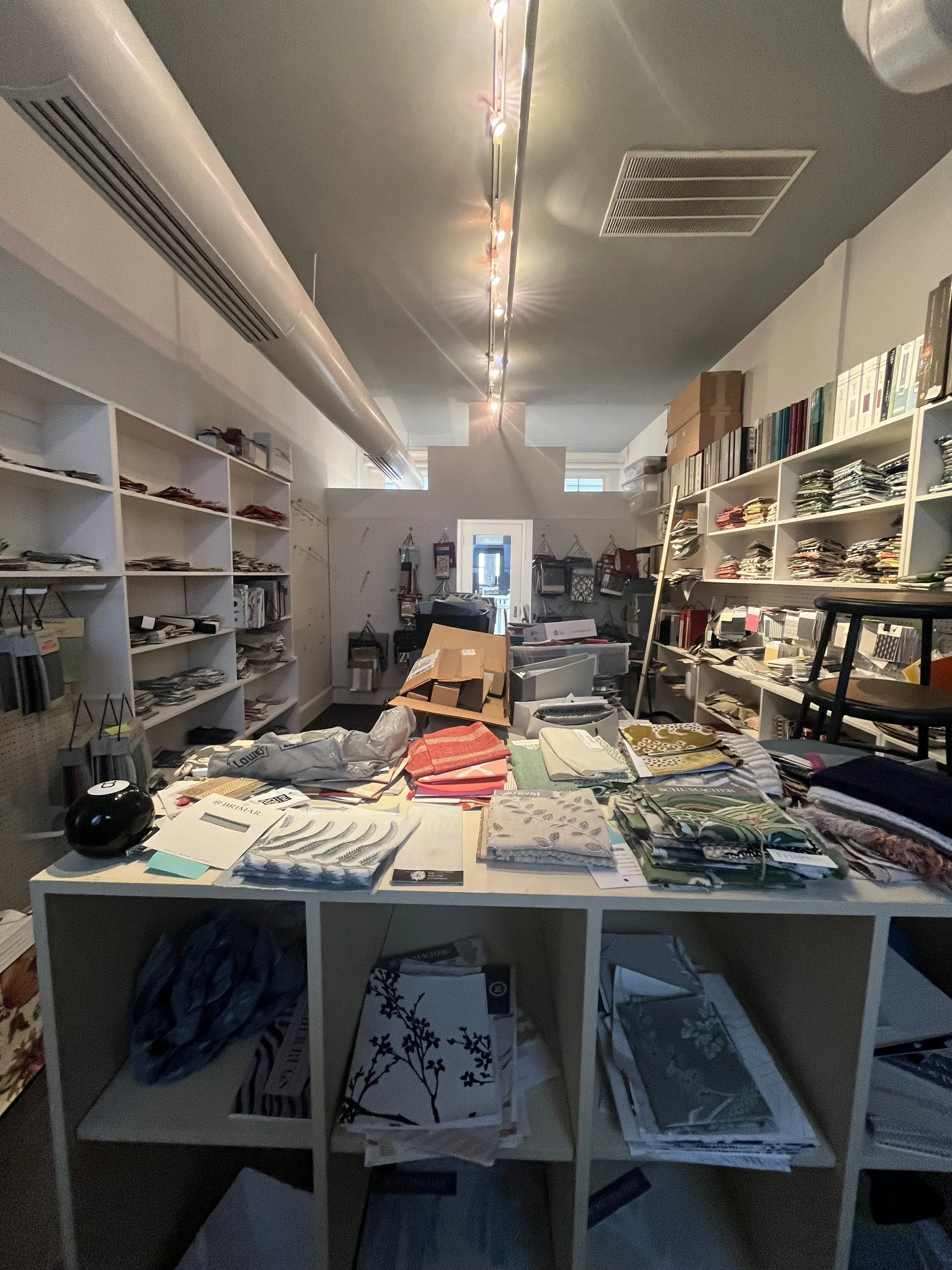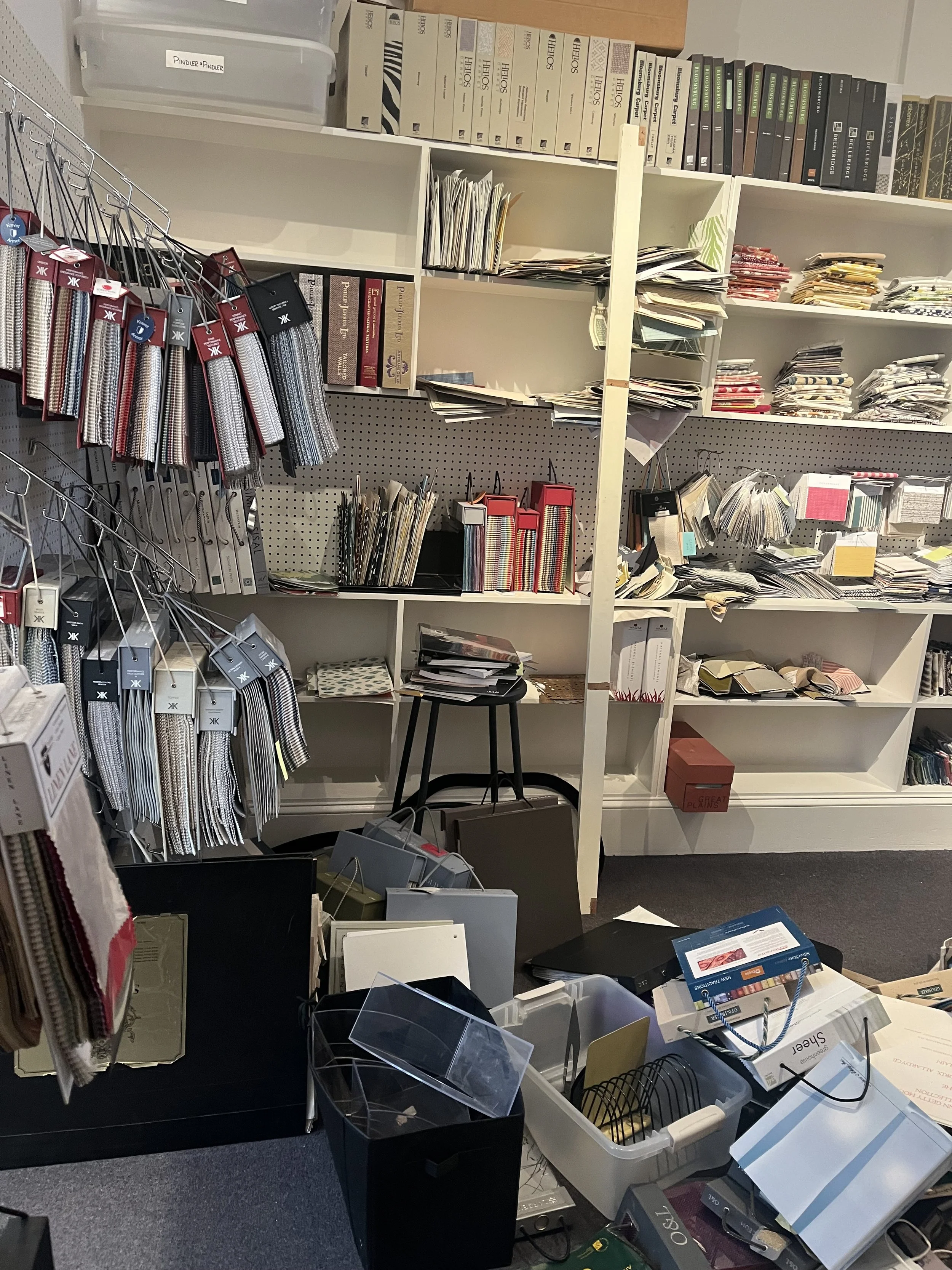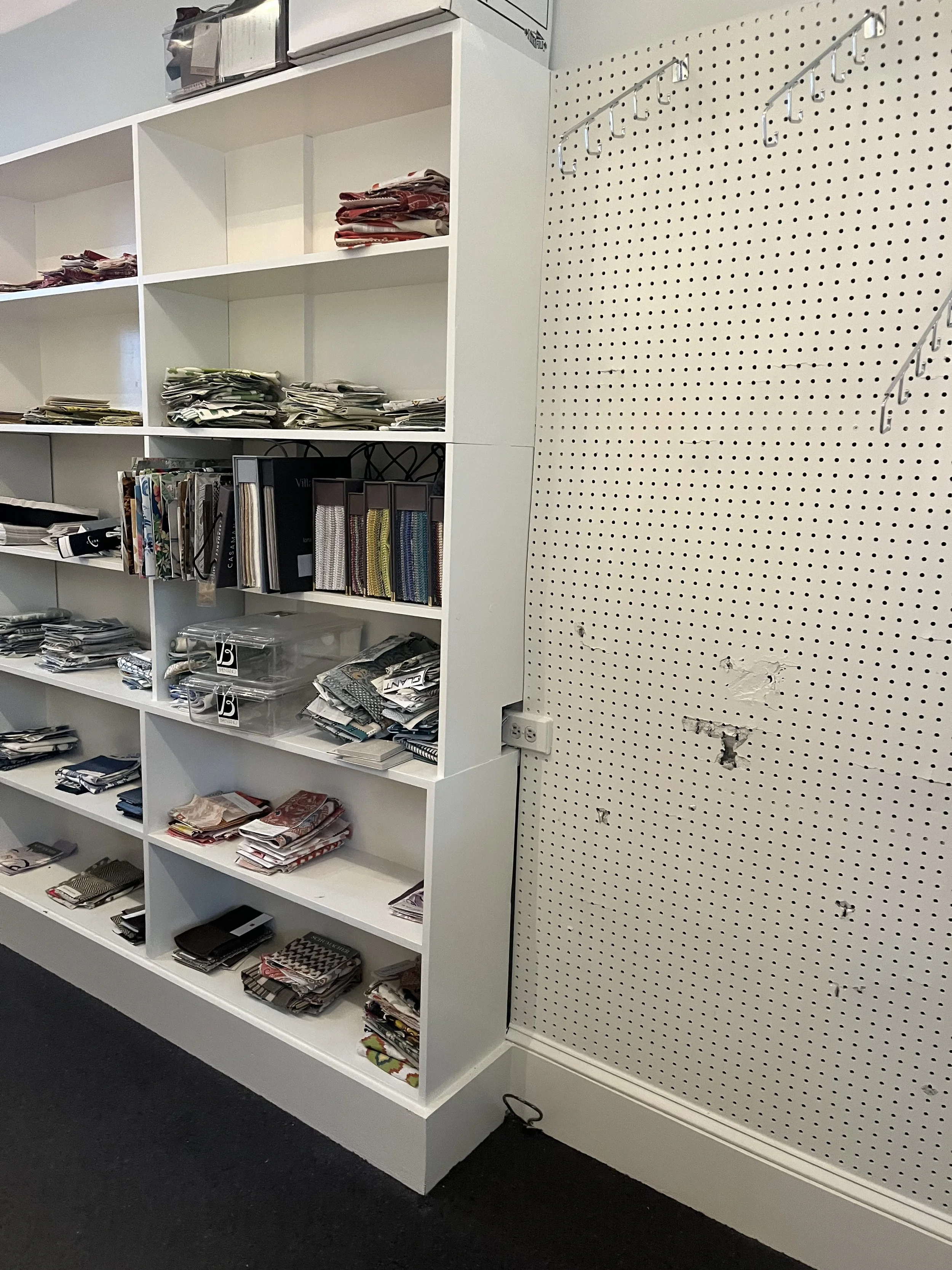 To start, Keith and I added track lights to the ceiling and curtain rods to the cubbies shown. We also implemented a hanging system for the fabrics that would also allow for better categorization. For the wallpaper, I split it into two sections. The grasscloth was divided up by color and pattern in magazine holders. However, the majority of the wallpaper would not fit in the organizers. Using pegboard hooks, I was able to attach curtain rods to the pegboard. To hang the wallpaper, I used drapery clips.
