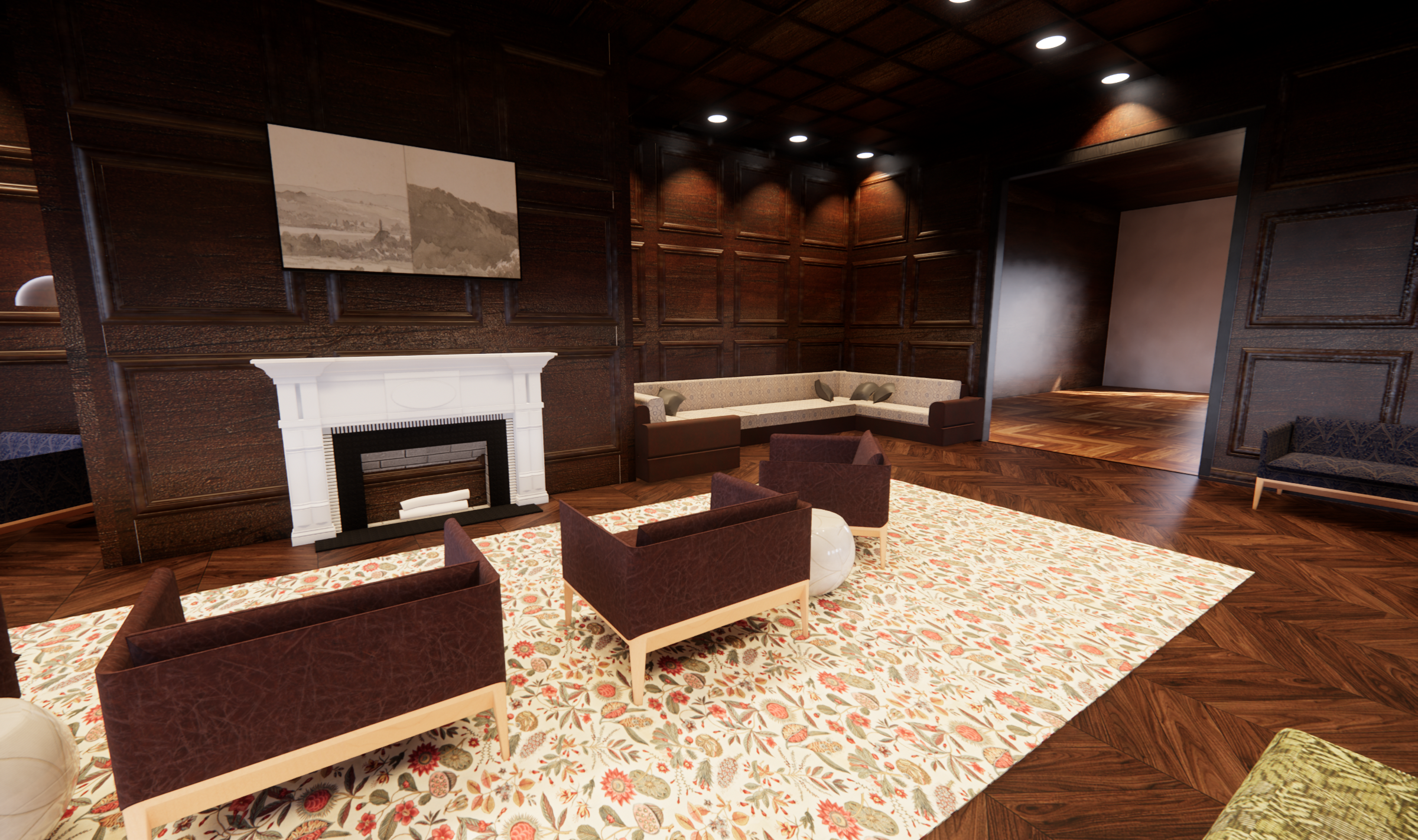 The Tudor-style salon acts as a formal, intimate waiting area for hotel patrons. A classic mantel and dark wood paneling sophisticate the space, while patterned fabrics add a dark feminine touch.